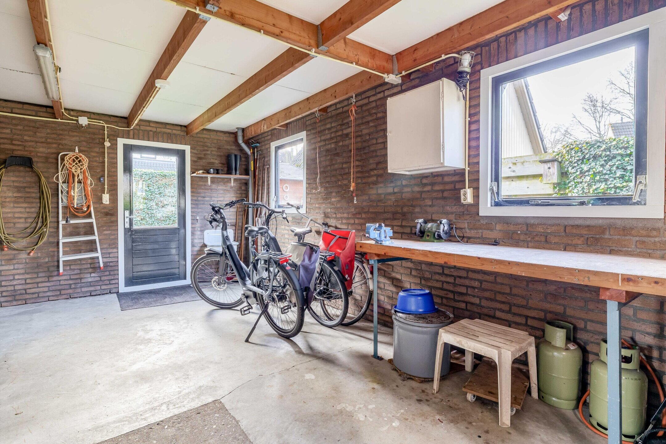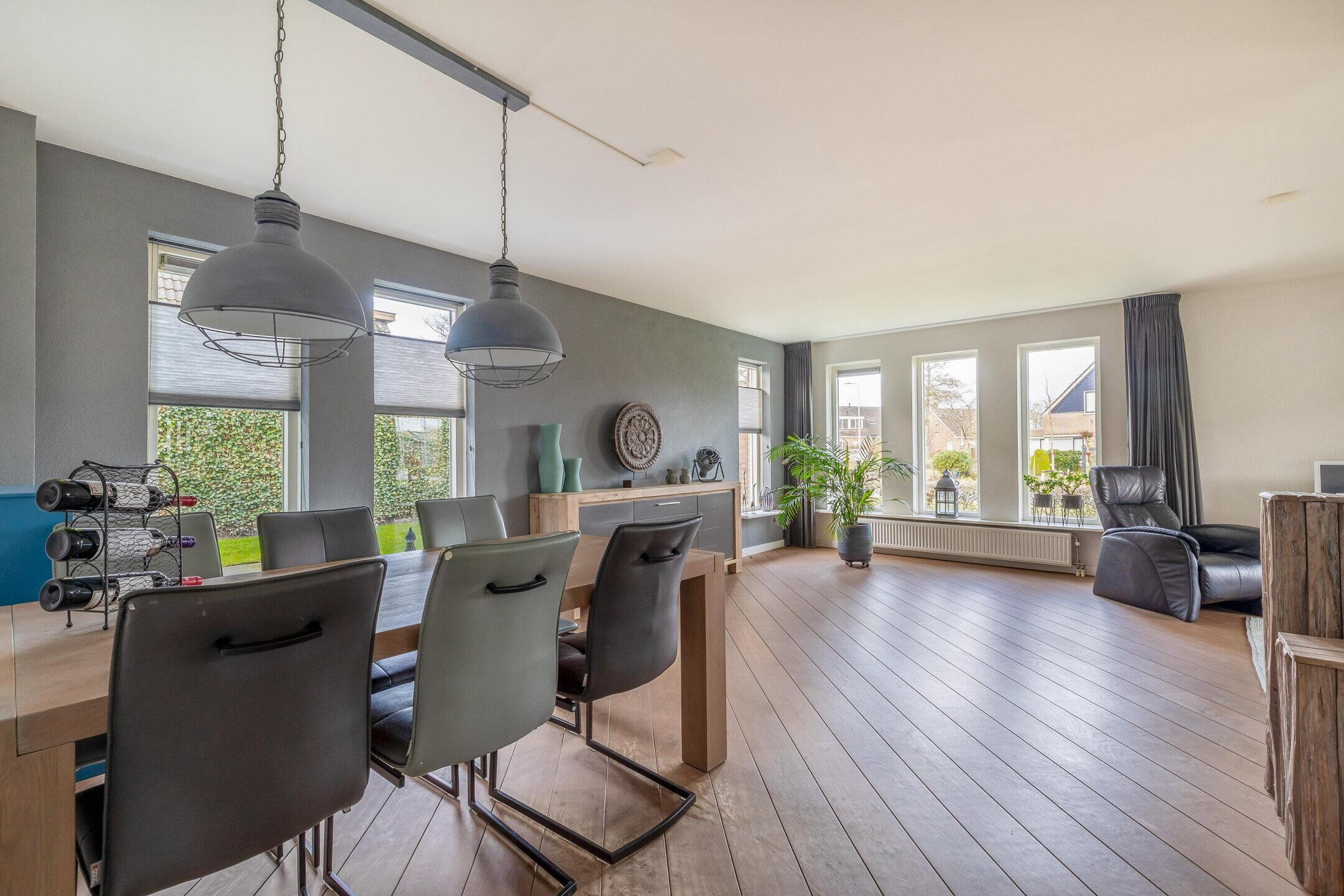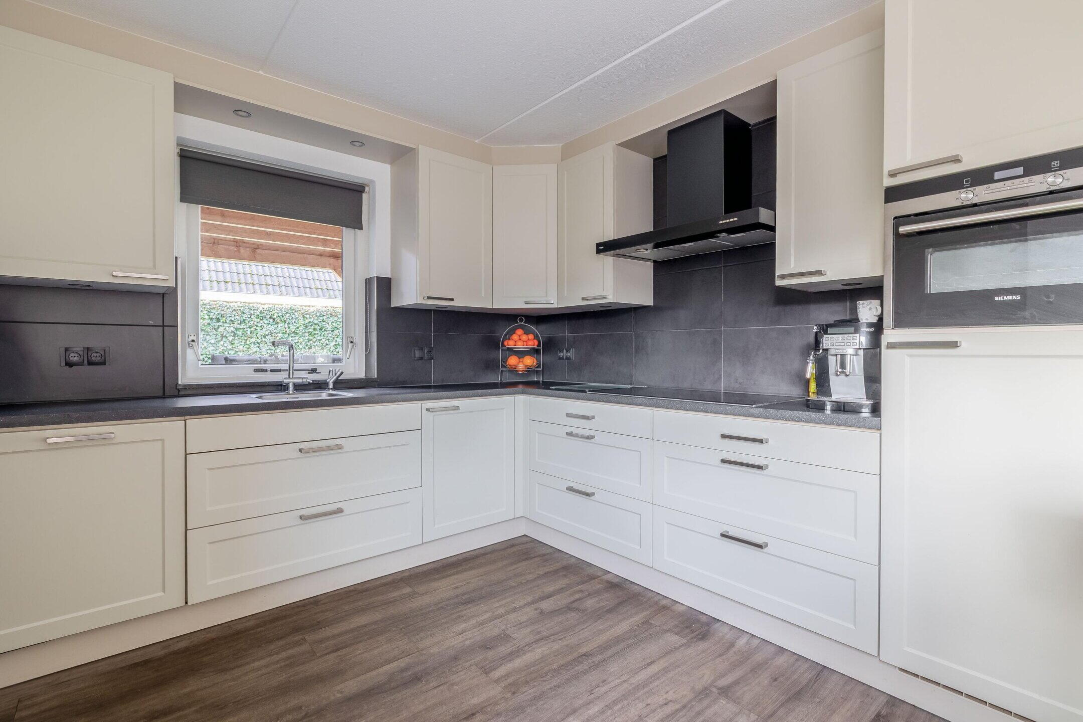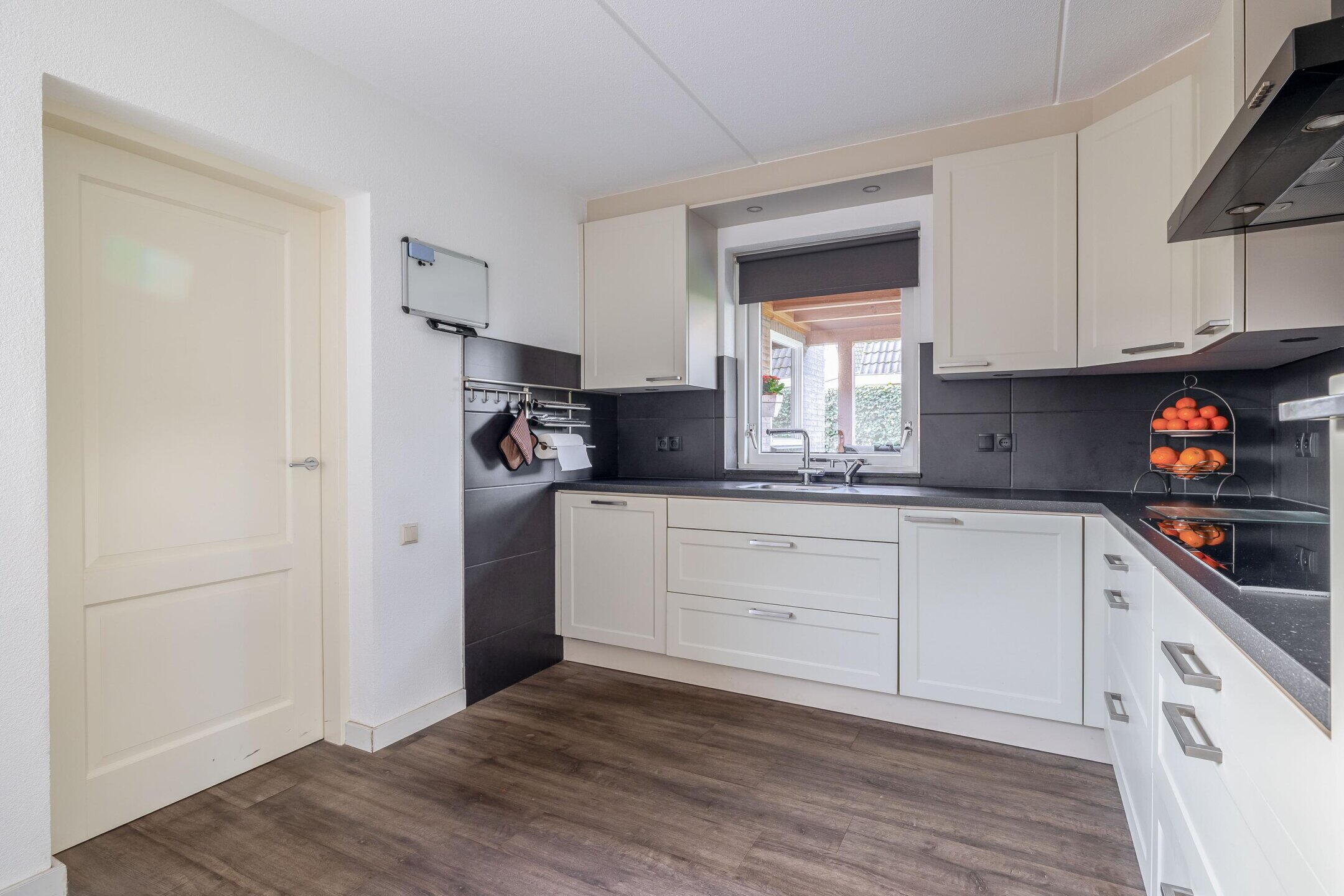 Je komt via de zijkant van de woning binnen in de hal met trapopgang, een net toilet met fonteintje, de meterkast en toegang een praktische slaap-/werk-/hobbykamer en de woonkamer. Deze ruime woonkamer heeft een mooie houten vloer en door de vele ramen een fijne licht inval. Via de eethoek bereik je de dichte keuken. Het keukenblok in hoekopstelling heeft veel berg- en werkruimte en is voorzien van diverse inbouwapparatuur zoals een combimagnetron/oven, Quooker, afzuigkap, een inductiekookplaat (2023) en een vaatwasser (2022). Er zijn 2 ramen waarvan één boven de wasbak. Aansluitend is de grote bijkeuken met witgoedaansluiting, CV-opstelling, voldoende bergruimte en een deur naar buiten. Ook kun je van hieruit binnendoor naar de riante L-vormige garage. Ook hier is een deur naar buiten, een sectionele garagedeur en drie ramen voor natuurlijk daglicht. Op het platte dak van de garage liggen 8 zonnepanelen.