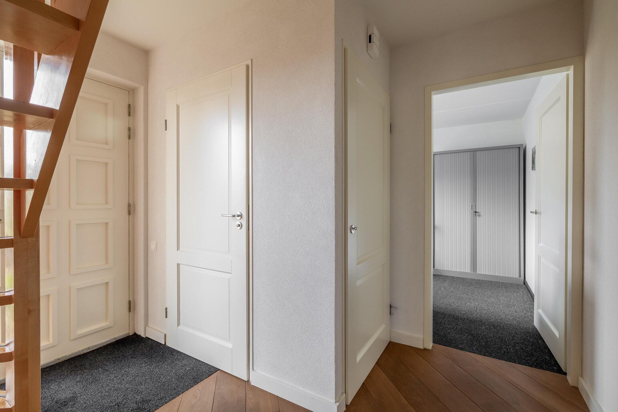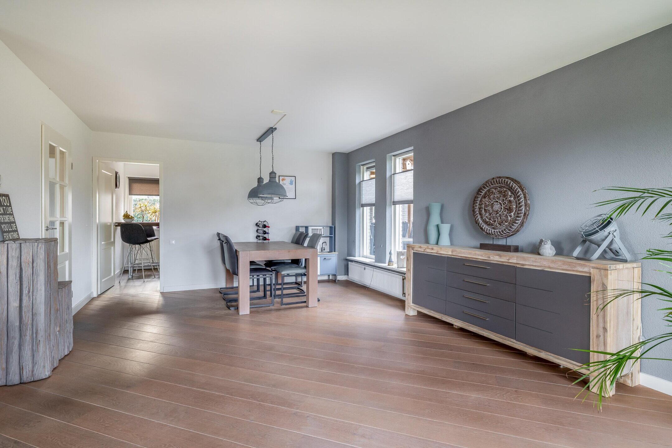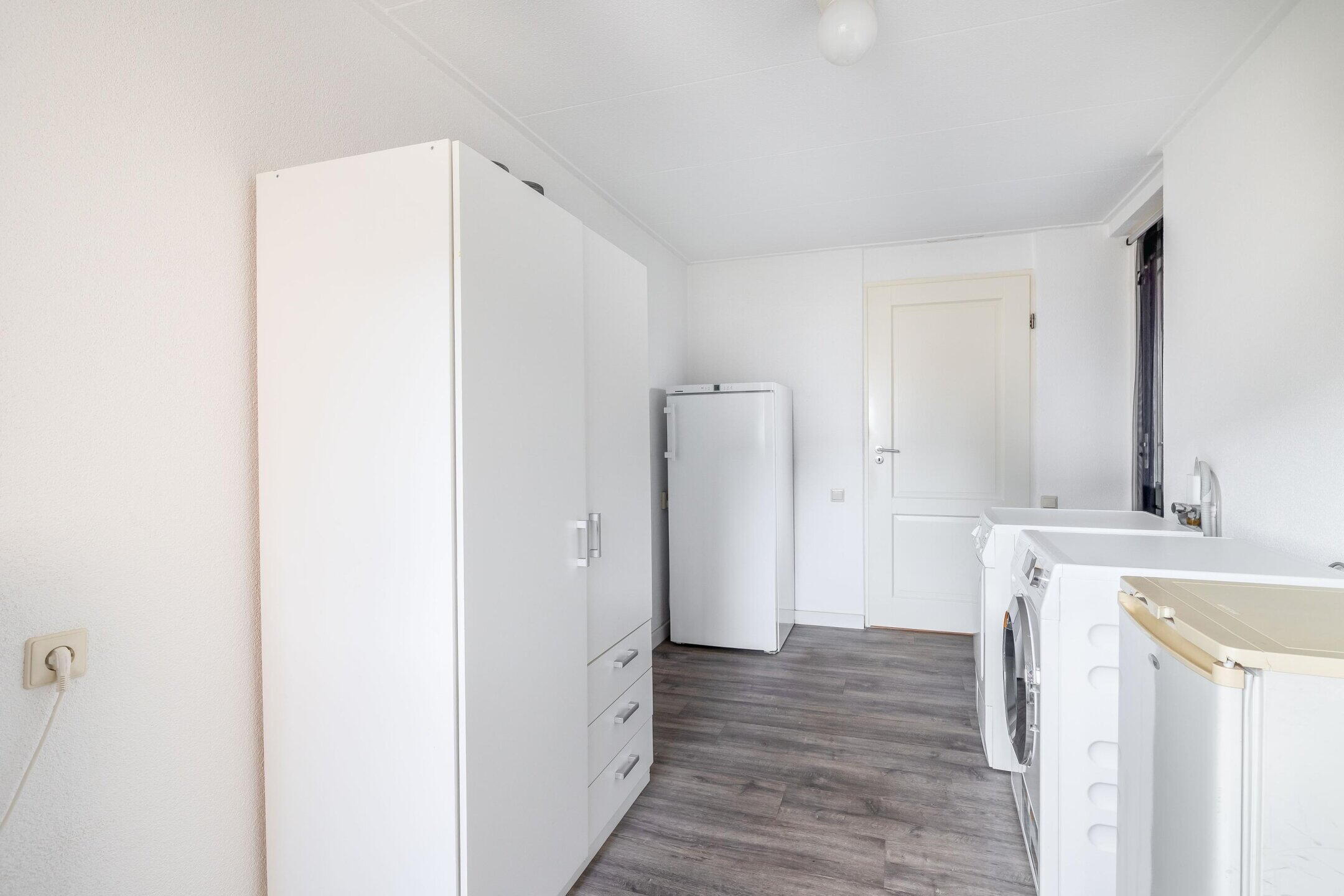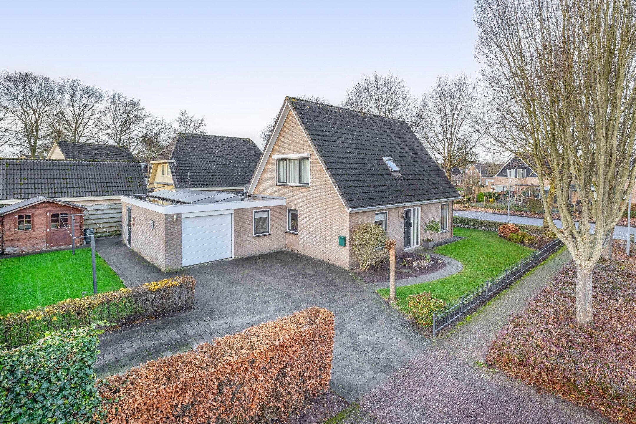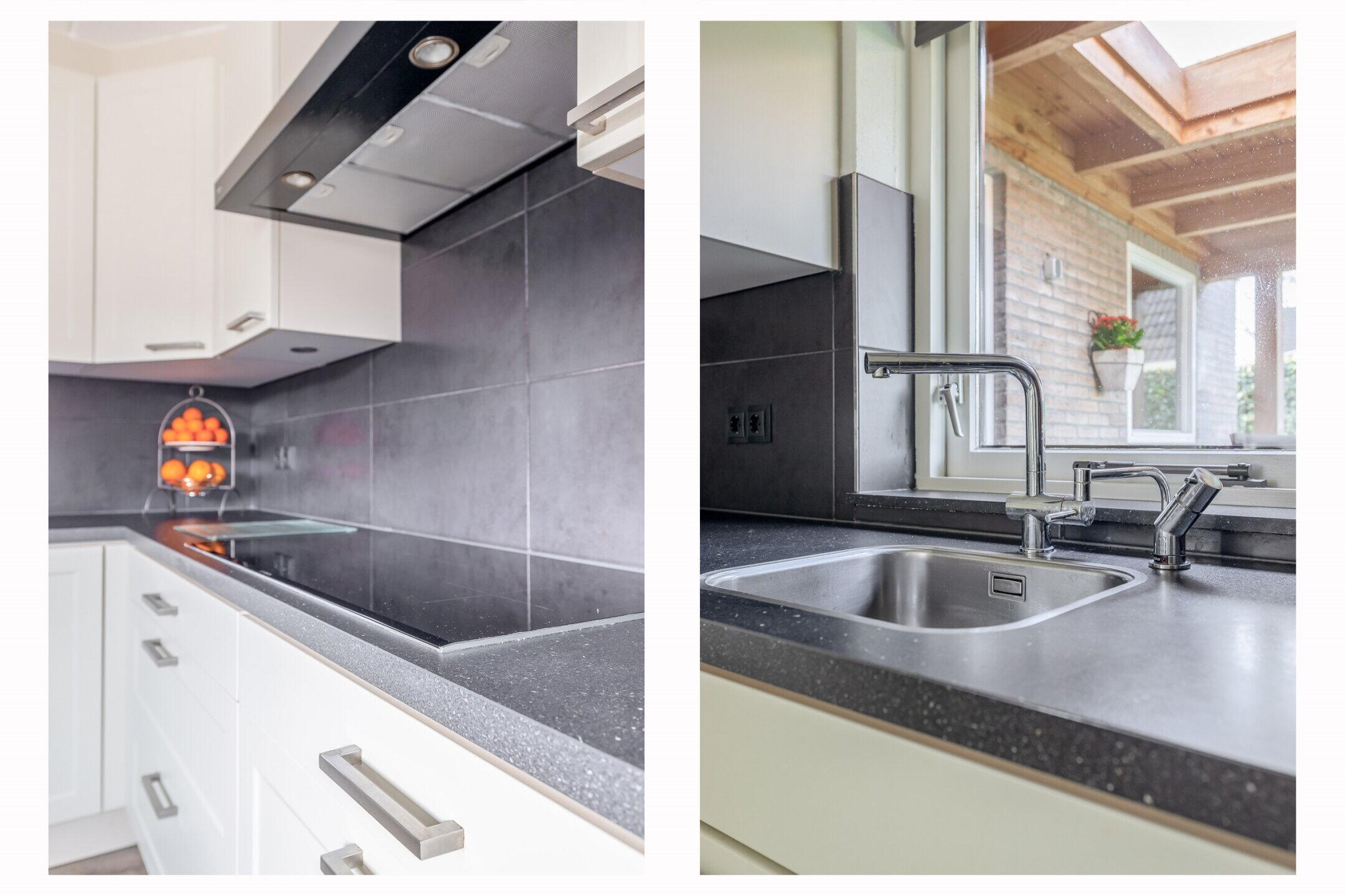 Je komt via de zijkant van de woning binnen in de hal met trapopgang, een net toilet met fonteintje, de meterkast en toegang een praktische slaap-/werk-/hobbykamer en de woonkamer. Deze ruime woonkamer heeft een mooie houten vloer en door de vele ramen een fijne licht inval. Via de eethoek bereik je de dichte keuken. Het keukenblok in hoekopstelling heeft veel berg- en werkruimte en is voorzien van diverse inbouwapparatuur zoals een combimagnetron/oven, Quooker, afzuigkap, een inductiekookplaat (2023) en een vaatwasser (2022). Er zijn 2 ramen waarvan één boven de wasbak. Aansluitend is de grote bijkeuken met witgoedaansluiting, CV-opstelling, voldoende bergruimte en een deur naar buiten. Ook kun je van hieruit binnendoor naar de riante L-vormige garage. Ook hier is een deur naar buiten, een sectionele garagedeur en drie ramen voor natuurlijk daglicht. Op het platte dak van de garage liggen 8 zonnepanelen.
