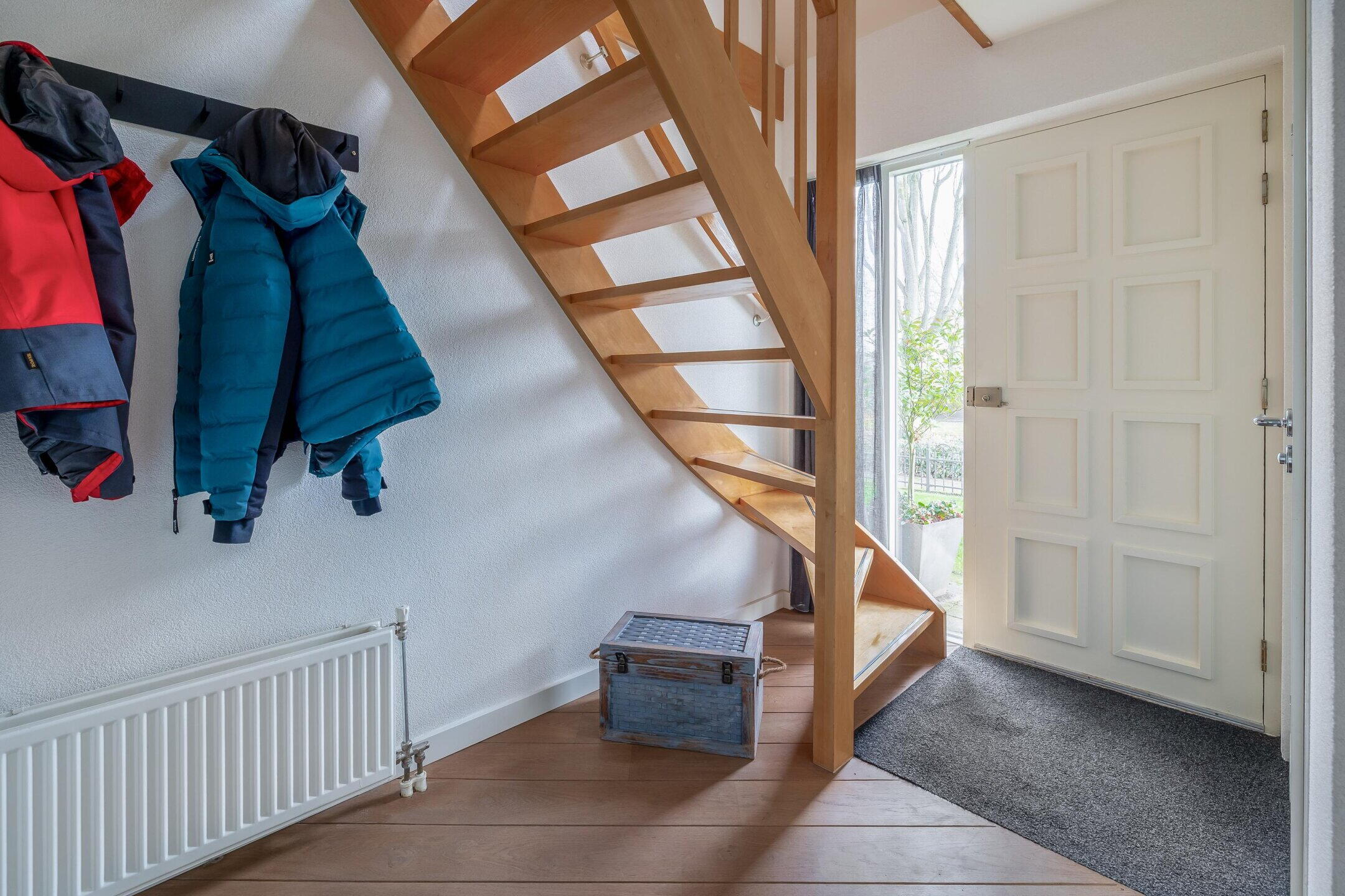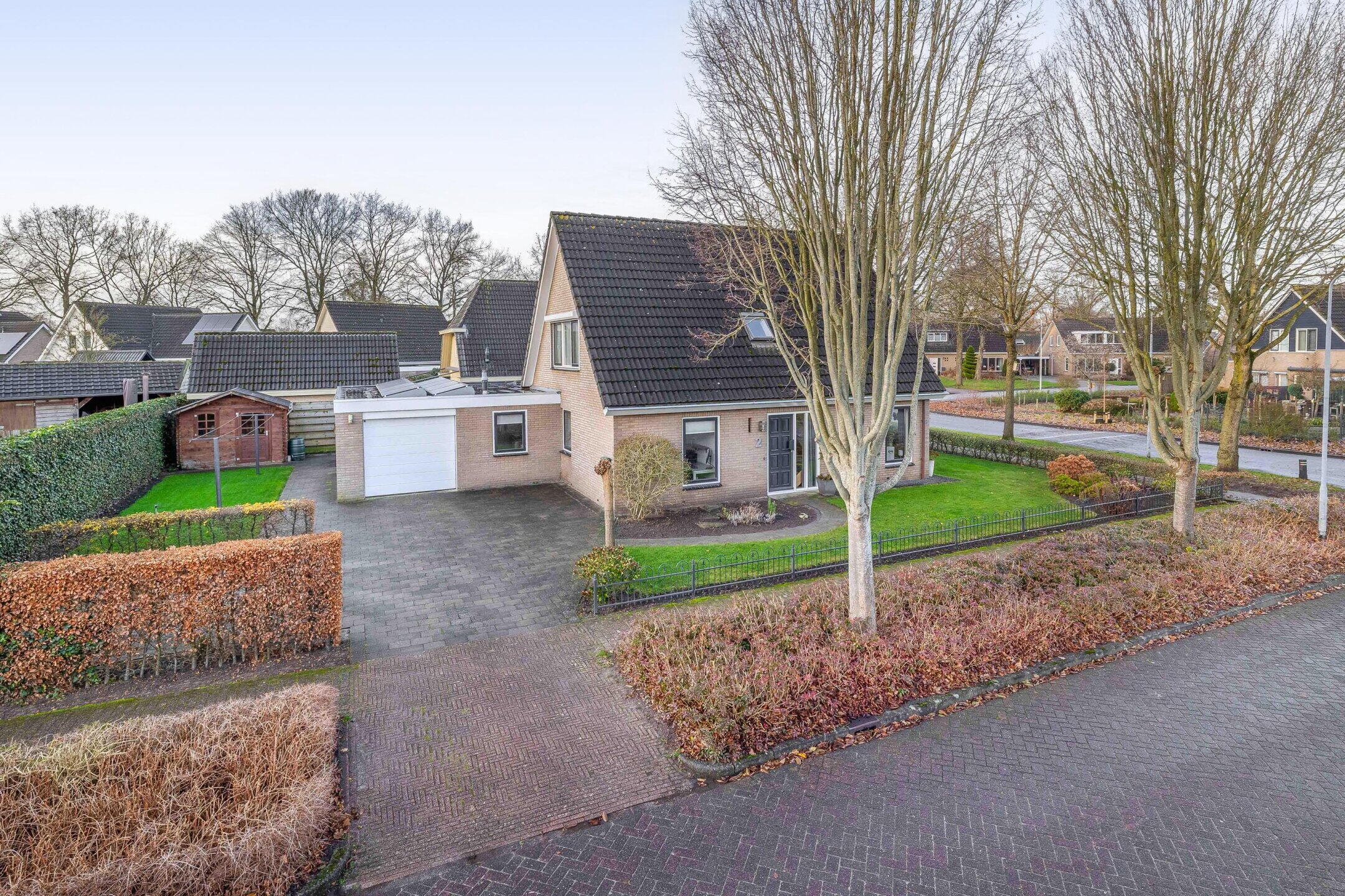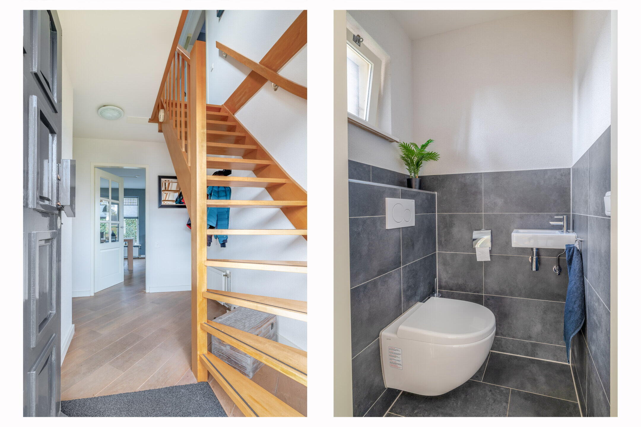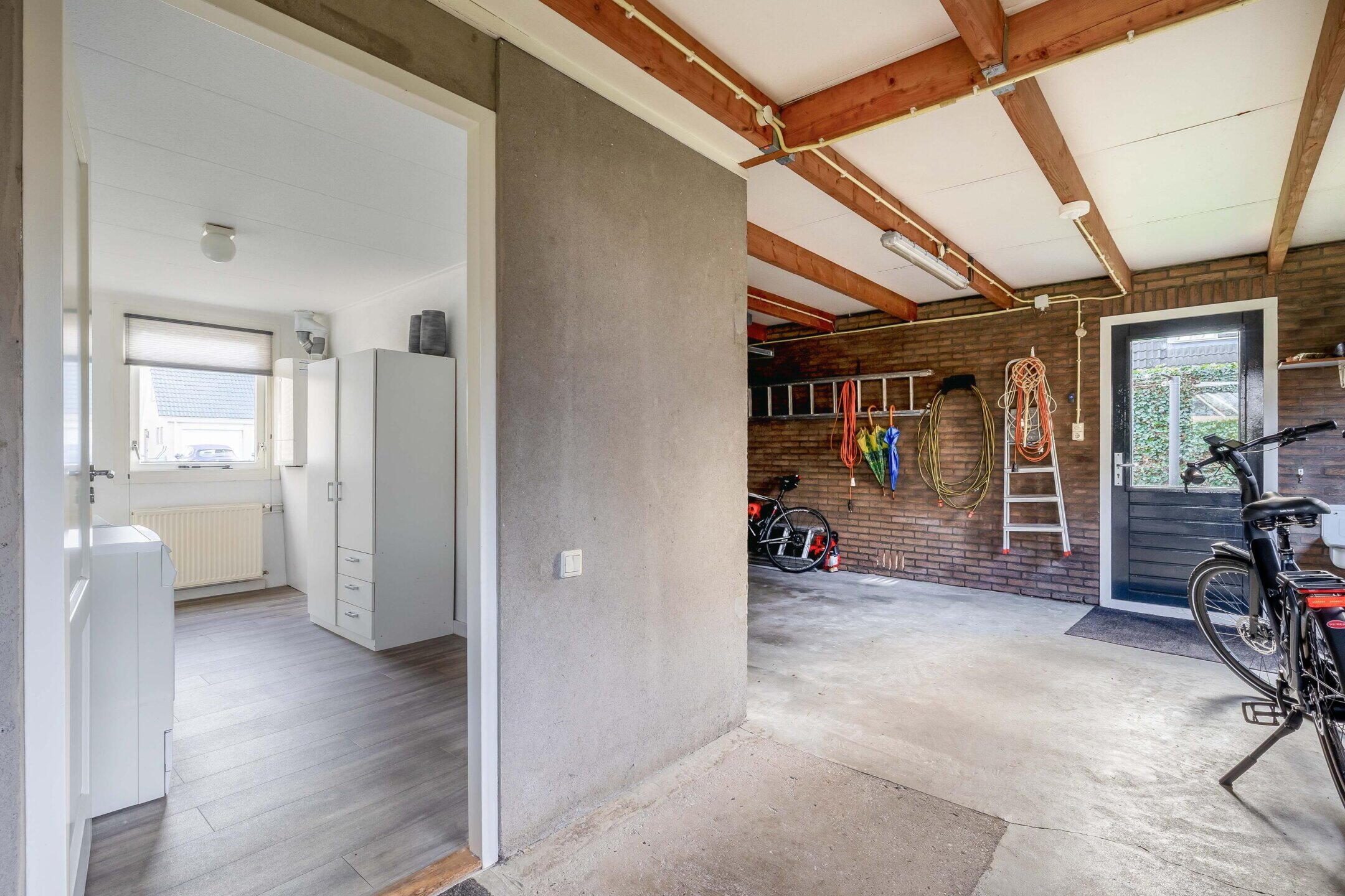Je komt via de zijkant van de woning binnen in de hal met trapopgang, een net toilet met fonteintje, de meterkast en toegang een praktische slaap-/werk-/hobbykamer en de woonkamer. Deze ruime woonkamer heeft een mooie houten vloer en door de vele ramen een fijne licht inval. Via de eethoek bereik je de dichte keuken. Het keukenblok in hoekopstelling heeft veel berg- en werkruimte en is voorzien van diverse inbouwapparatuur zoals een combimagnetron/oven, Quooker, afzuigkap, een inductiekookplaat (2023) en een vaatwasser (2022). Er zijn 2 ramen waarvan één boven de wasbak. Aansluitend is de grote bijkeuken met witgoedaansluiting, CV-opstelling, voldoende bergruimte en een deur naar buiten. Ook kun je van hieruit binnendoor naar de riante L-vormige garage. Ook hier is een deur naar buiten, een sectionele garagedeur en drie ramen voor natuurlijk daglicht. Op het platte dak van de garage liggen 8 zonnepanelen.