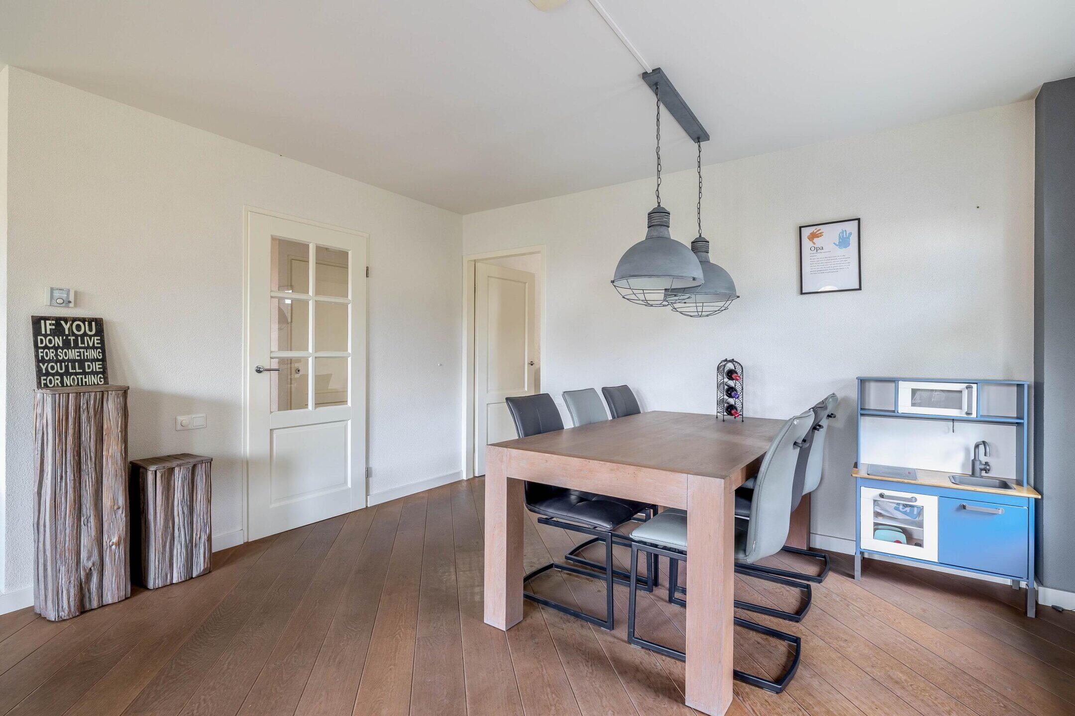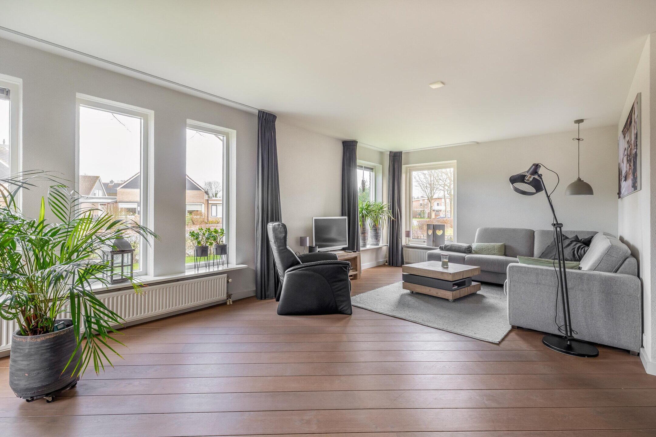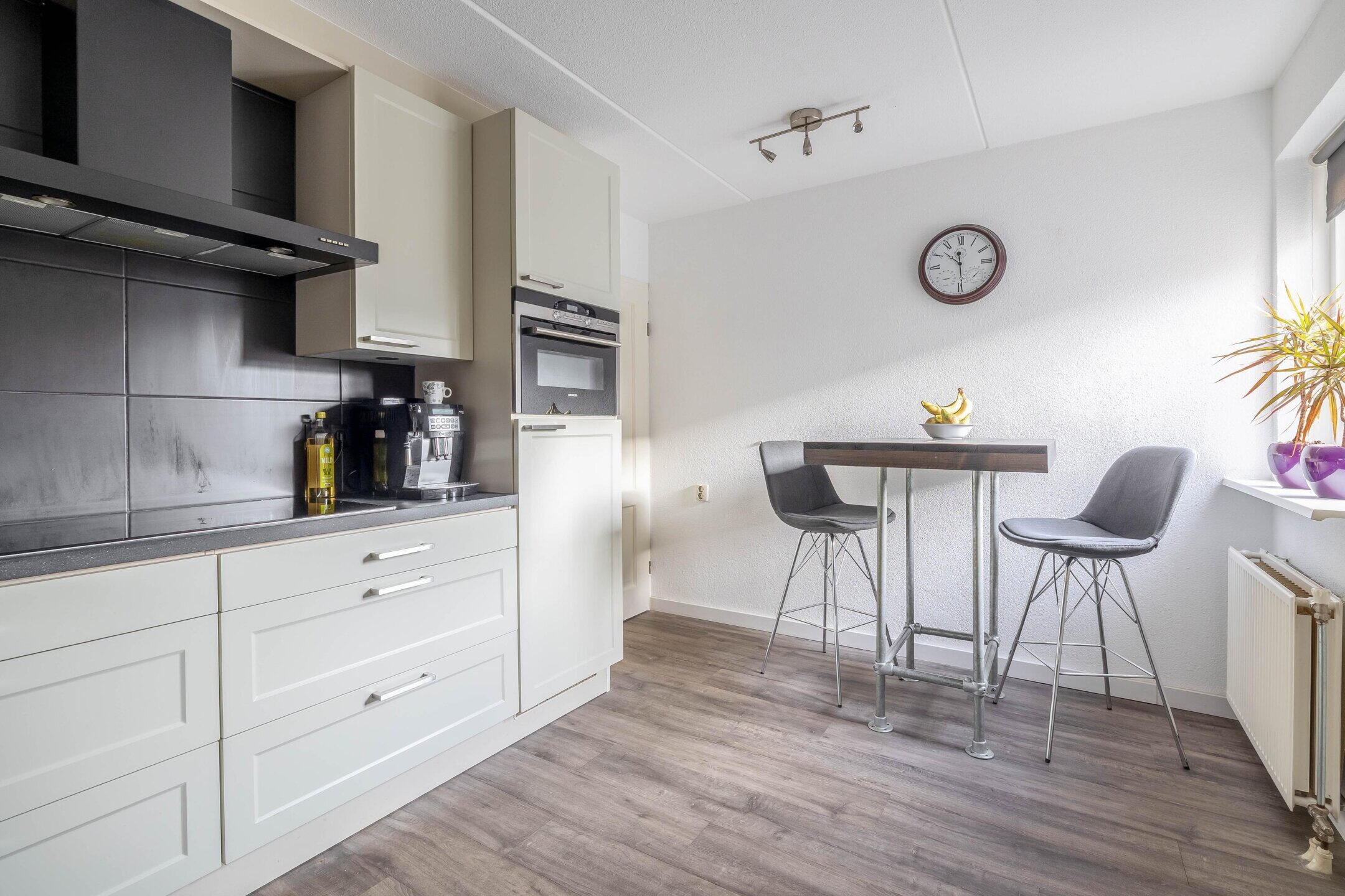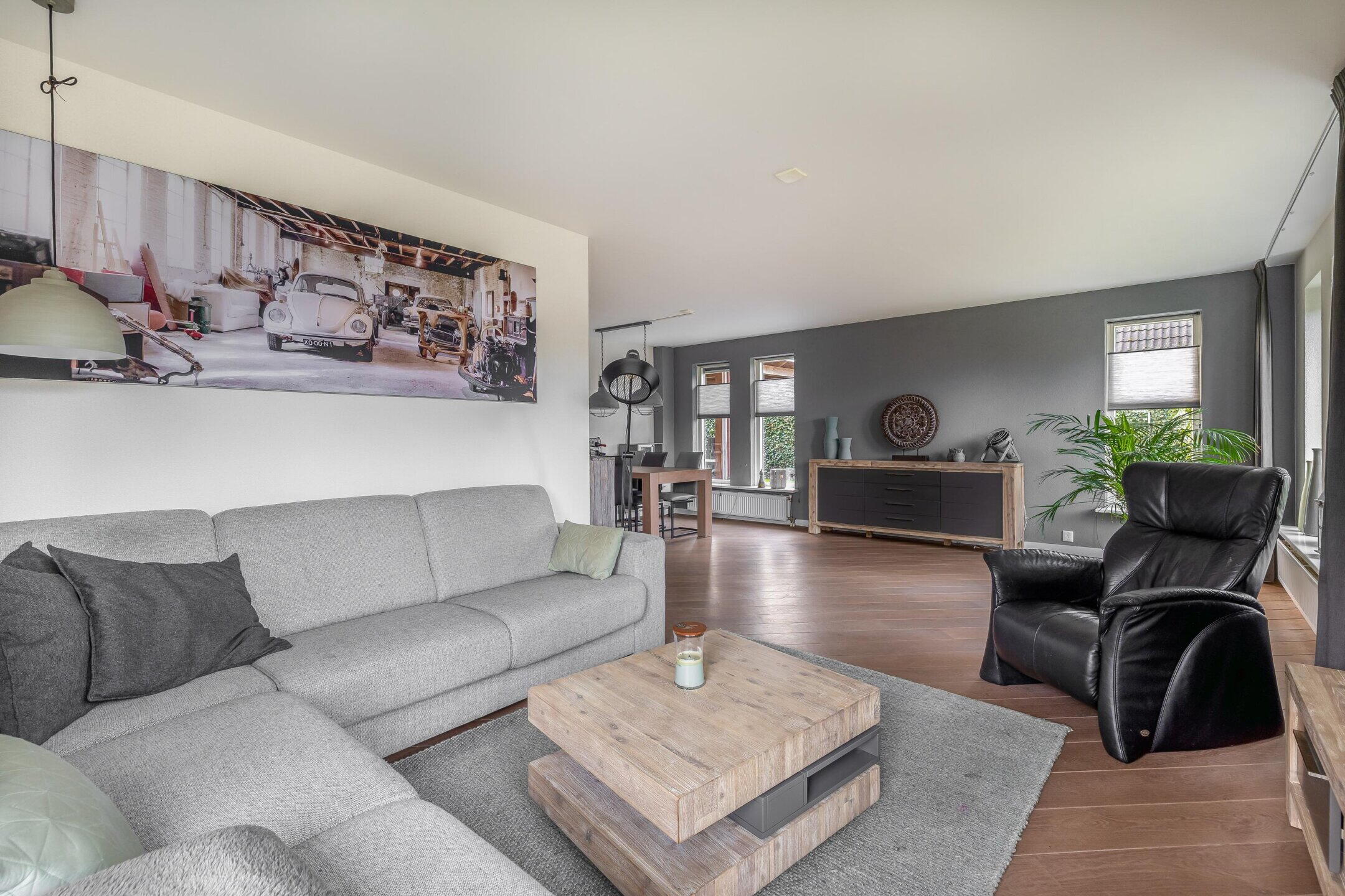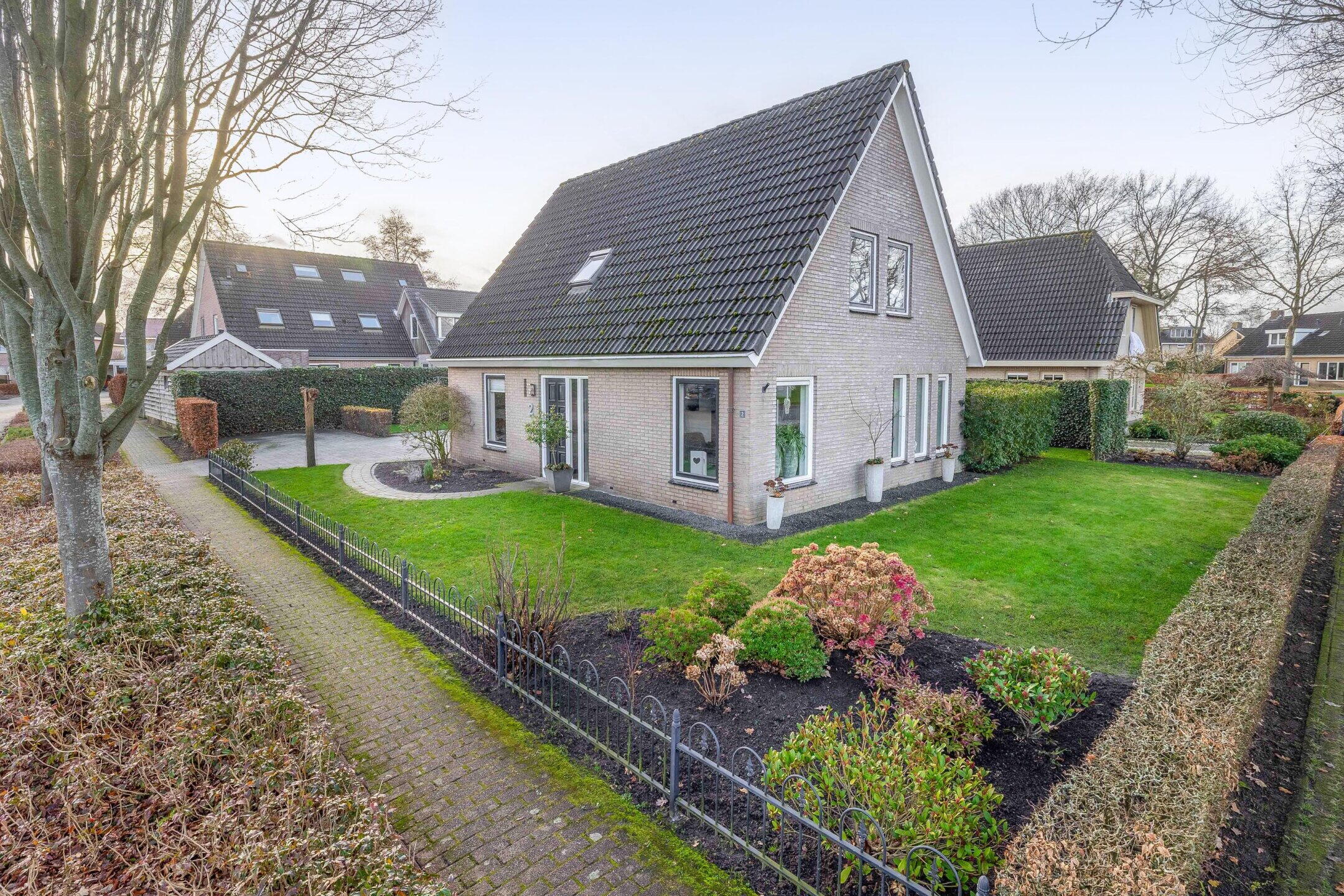 Je komt via de zijkant van de woning binnen in de hal met trapopgang, een net toilet met fonteintje, de meterkast en toegang een praktische slaap-/werk-/hobbykamer en de woonkamer. Deze ruime woonkamer heeft een mooie houten vloer en door de vele ramen een fijne licht inval. Via de eethoek bereik je de dichte keuken. Het keukenblok in hoekopstelling heeft veel berg- en werkruimte en is voorzien van diverse inbouwapparatuur zoals een combimagnetron/oven, Quooker, afzuigkap, een inductiekookplaat (2023) en een vaatwasser (2022). Er zijn 2 ramen waarvan één boven de wasbak. Aansluitend is de grote bijkeuken met witgoedaansluiting, CV-opstelling, voldoende bergruimte en een deur naar buiten. Ook kun je van hieruit binnendoor naar de riante L-vormige garage. Ook hier is een deur naar buiten, een sectionele garagedeur en drie ramen voor natuurlijk daglicht. Op het platte dak van de garage liggen 8 zonnepanelen.
