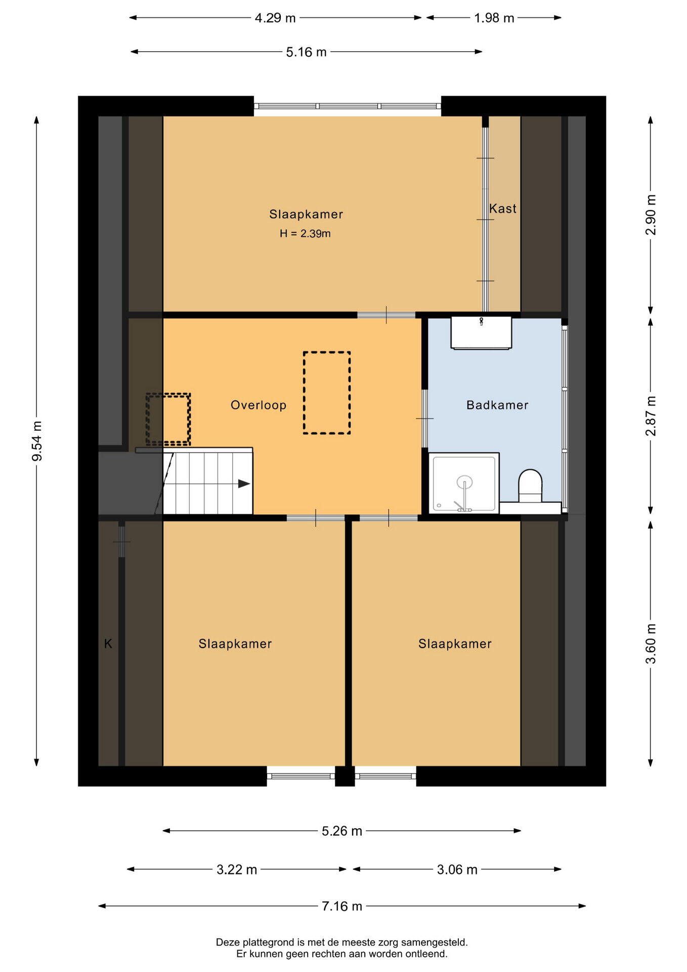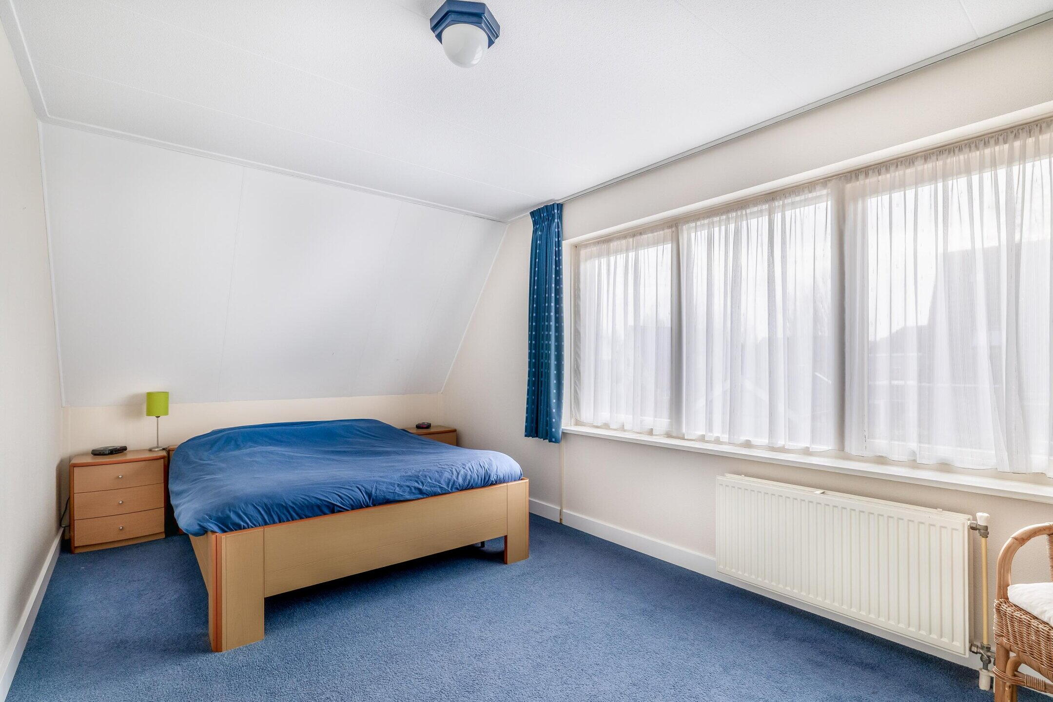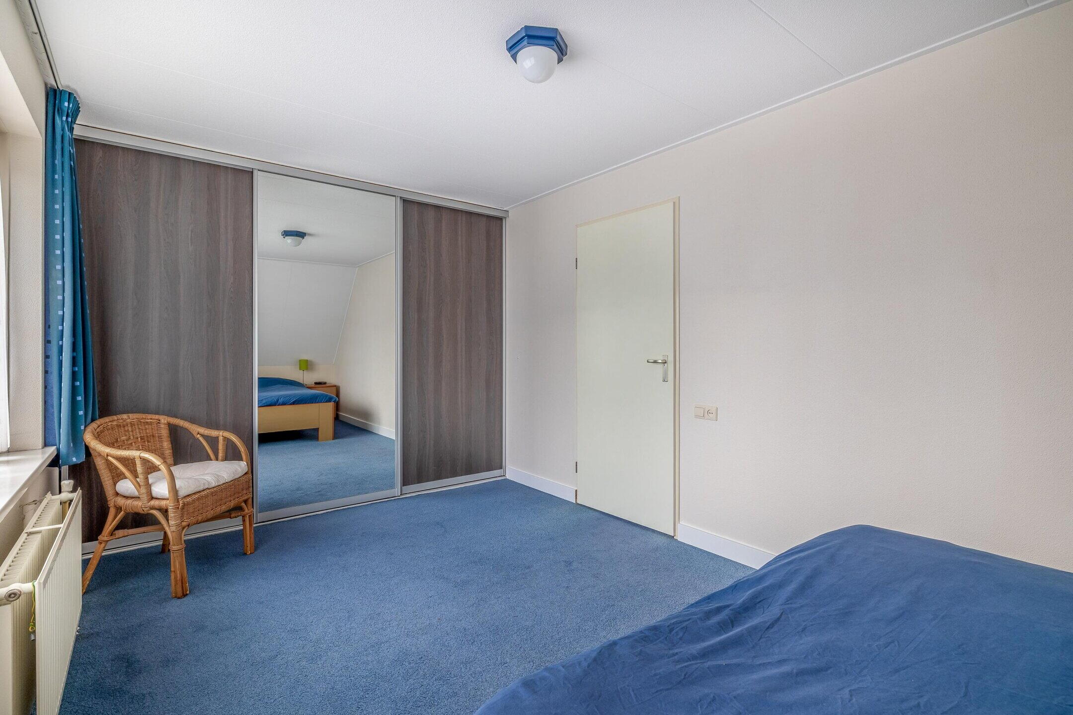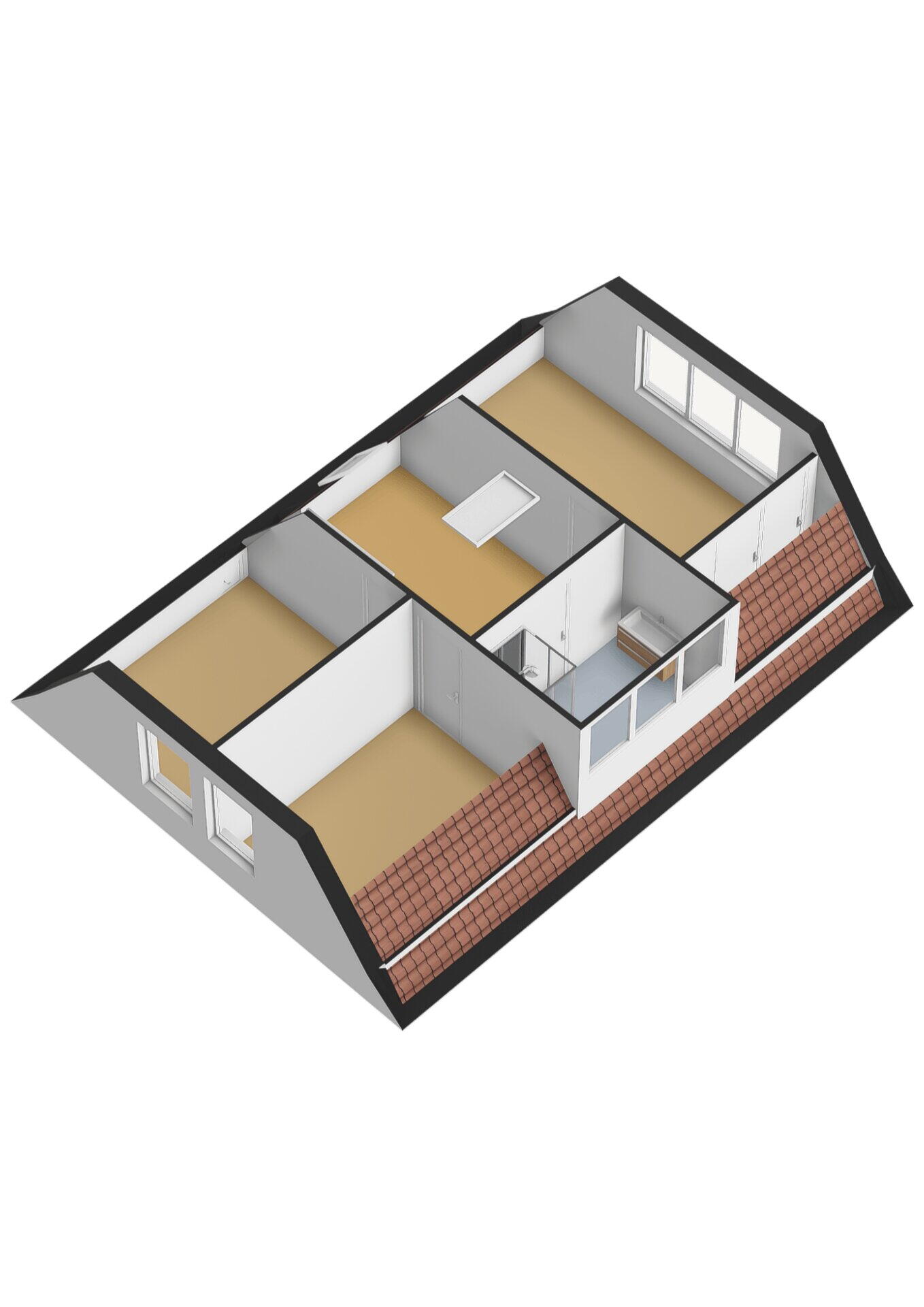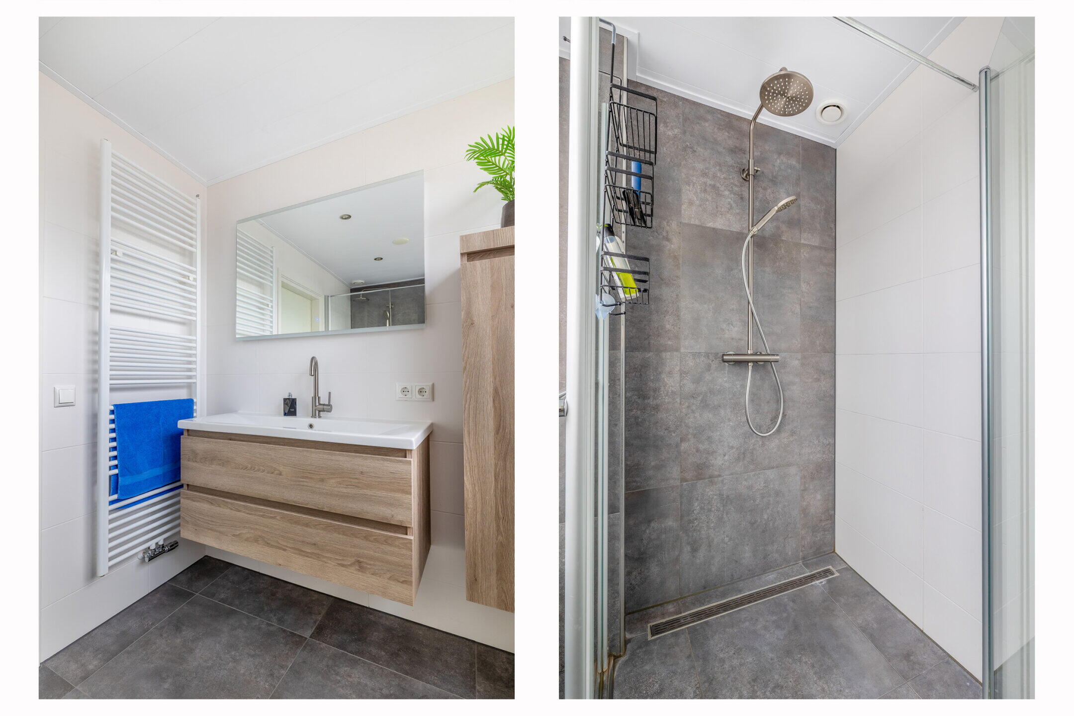 Hier vind je een ruime overloop met dakraam en toegang tot de 3 slaapkamers en badkamer. De achterste slaapkamer is over de gehele breedte van de woning en heeft een inbouwkast met schuifdeuren. Voor het raam zit een rolluik die met een app is te bedienen. Aan de voorzijde zijn nog 2 slaapkamers. Bij alle slaapkamers kun je handig gebruik maken van de bergruimte achter de knieschotten, te bereiken via een luik.