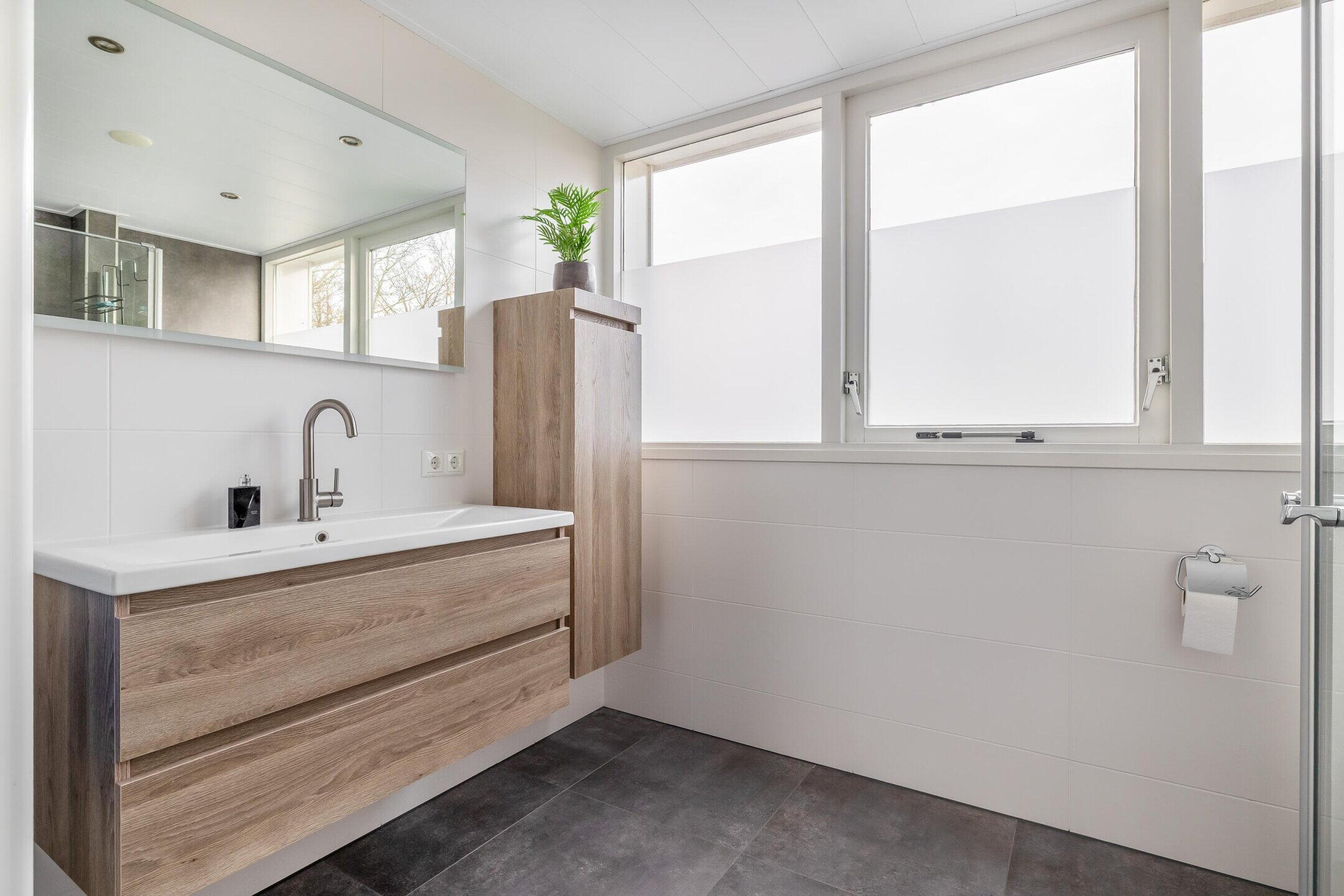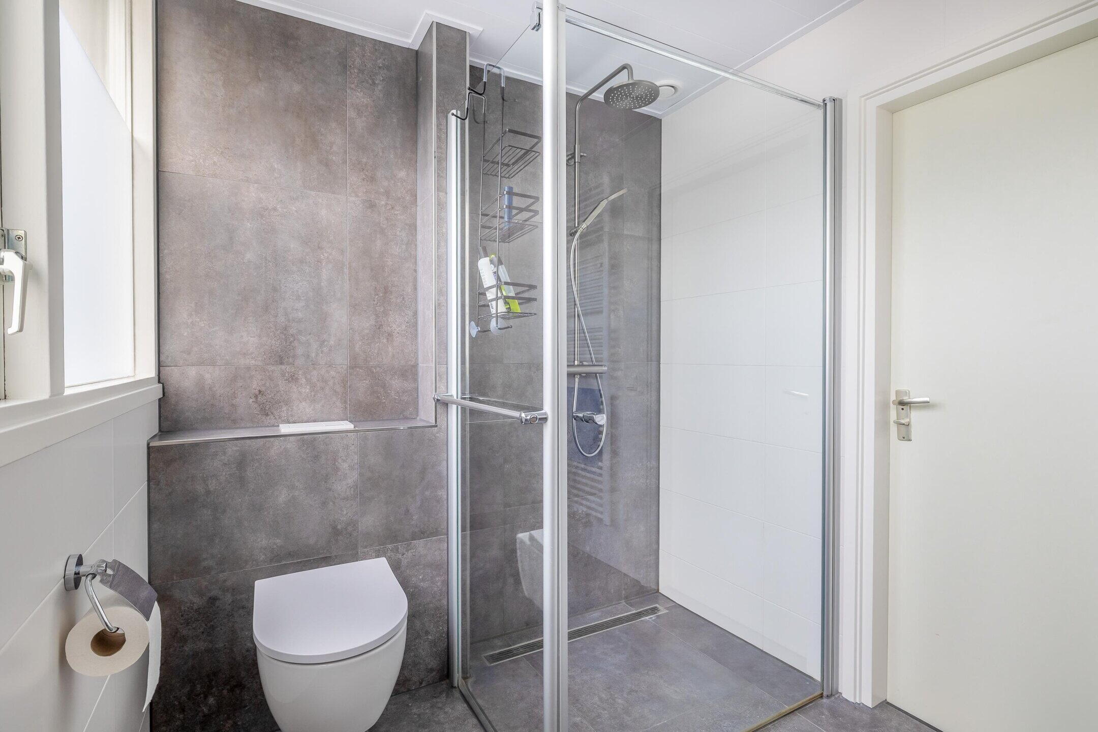 De luxe badkamer met grote dakkapel is vernieuwd in 2021 en voorzien van een wastafelmeubel met grote wastafel en bergruimte, designradiator, een toilet en een glazen douchecabine.