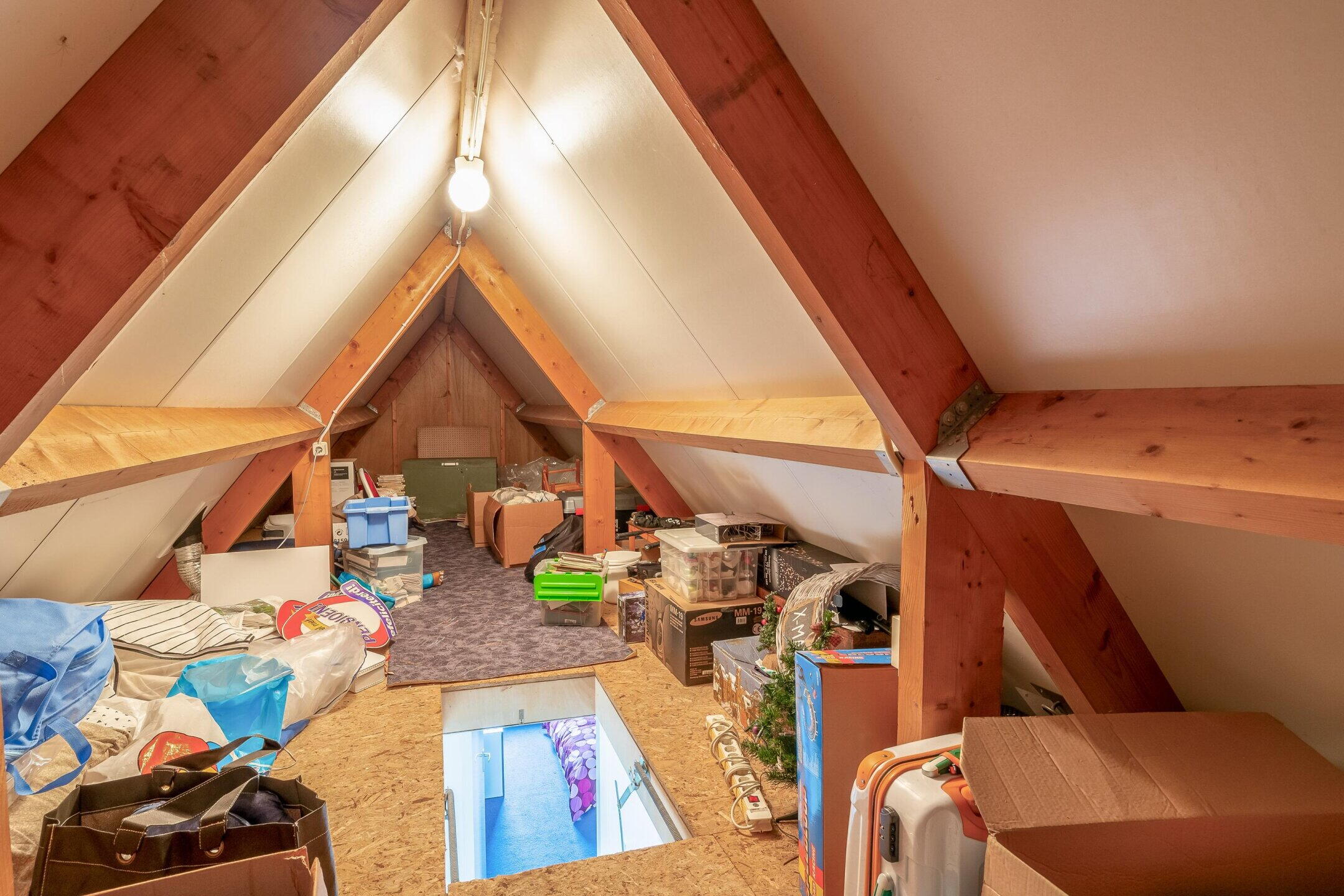 De beloopbare zolder is bereikbaar vanaf de overloop middels een vlizotrap. Deze ruimte is netjes afgewerkt, biedt veel bergruimte en er is elektra.