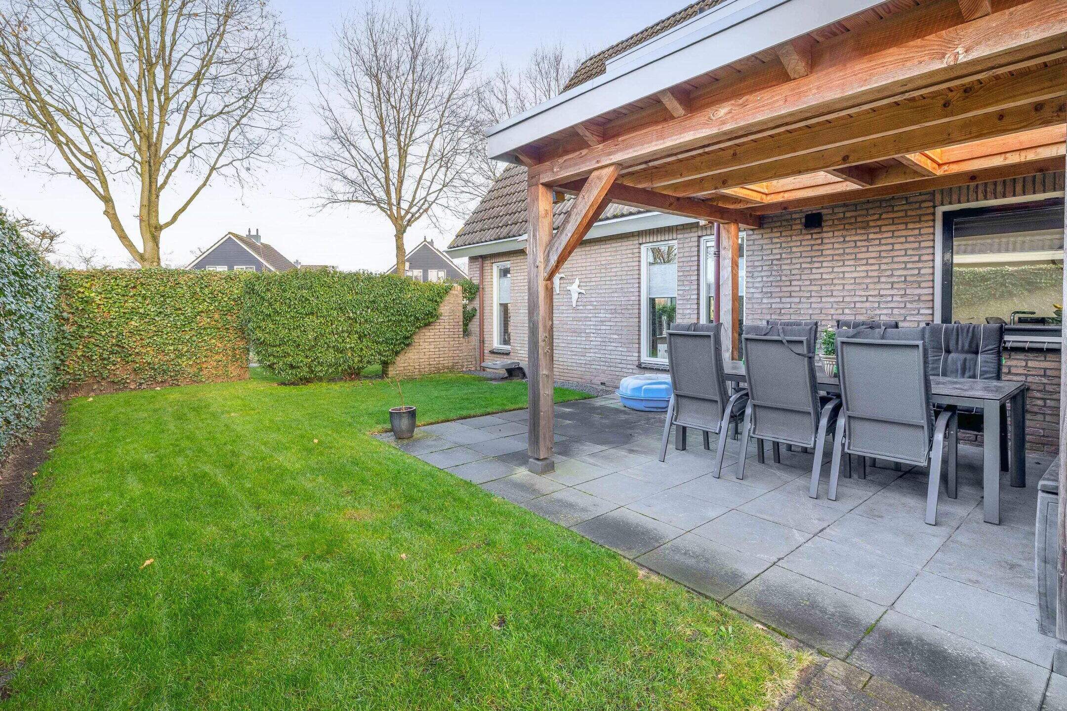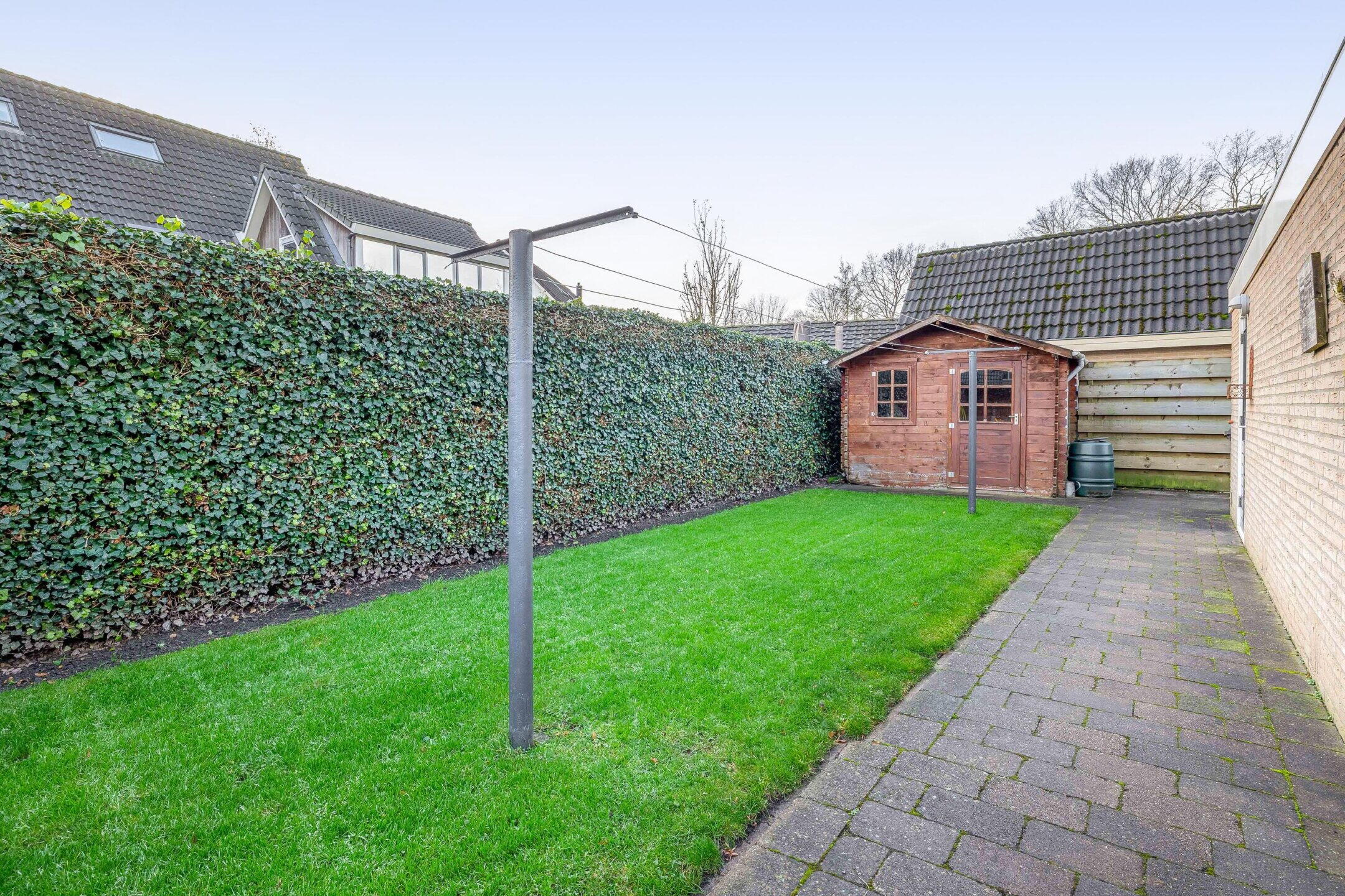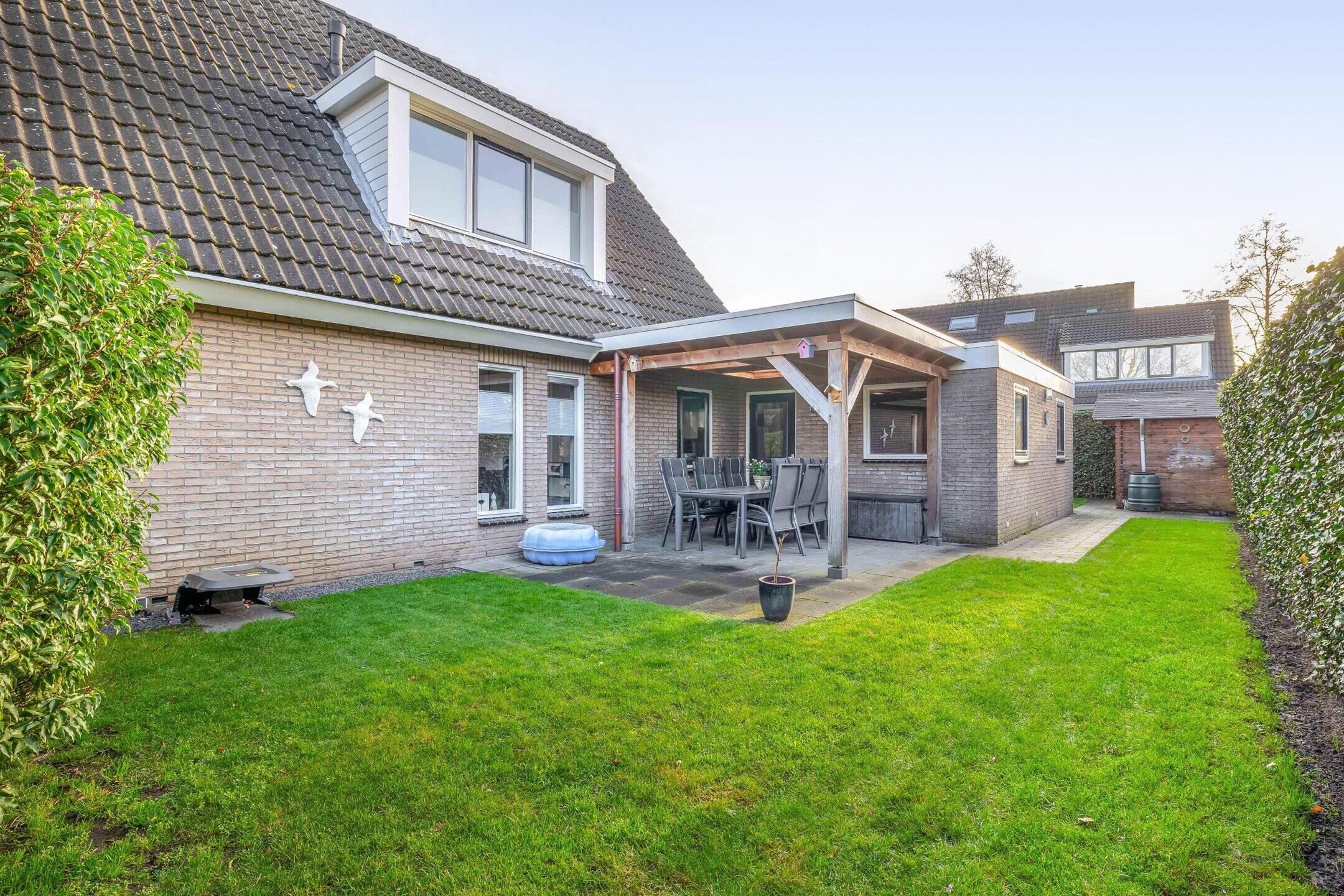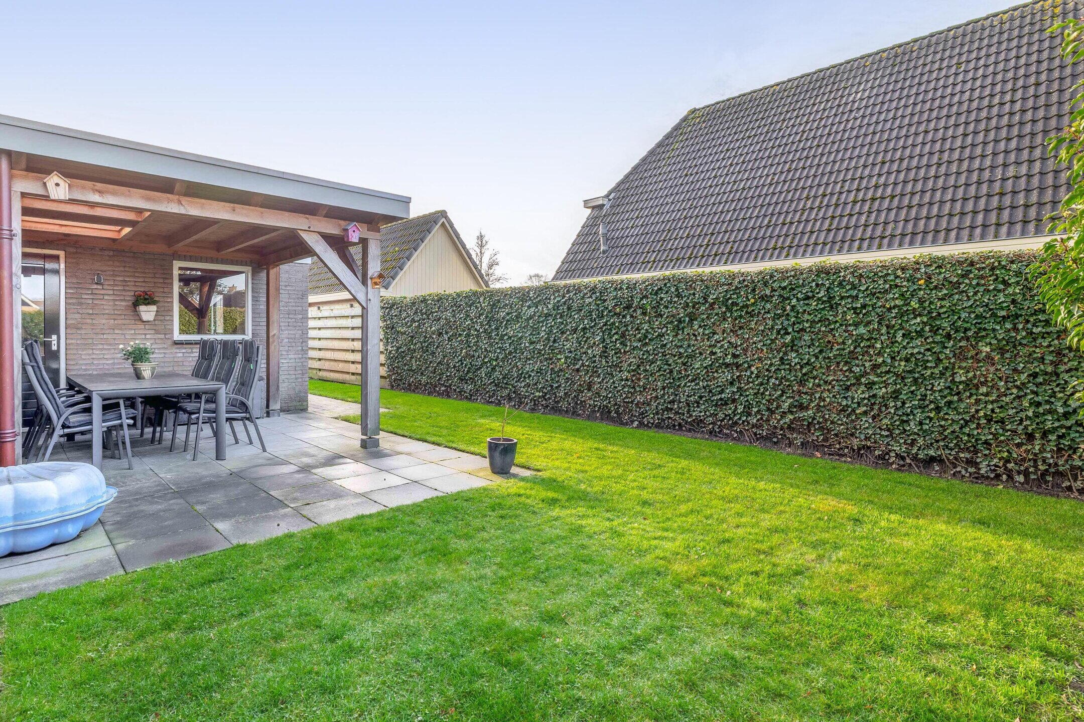 De tuin is rondom gelegen en netjes onderhouden. Er is een robotmaaier aanwezig. De heggen rondom bieden de nodige privacy en je hebt een eigen royale oprit met voldoende parkeerruimte. Ook is er een gedeelde grondwaterbron aanwezig. Achterin staat een tuinschuurtje en aan de zijkant, naast de keuken, is een overkapping met lichtkoepel geplaatst boven het terras waardoor je daar fijn en droog kunt zitten.