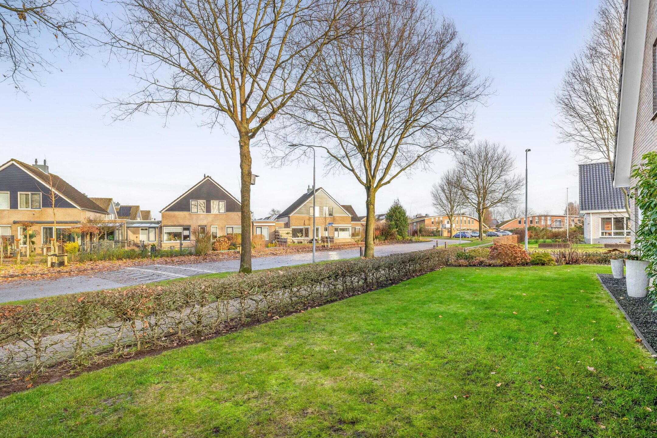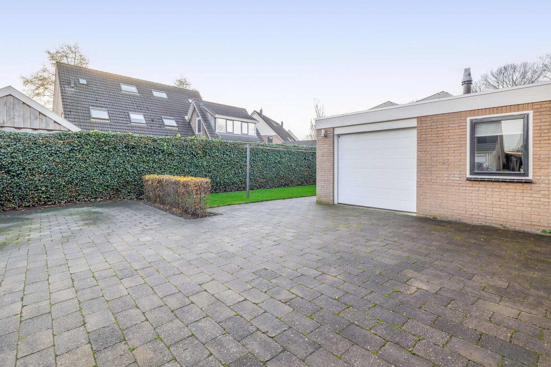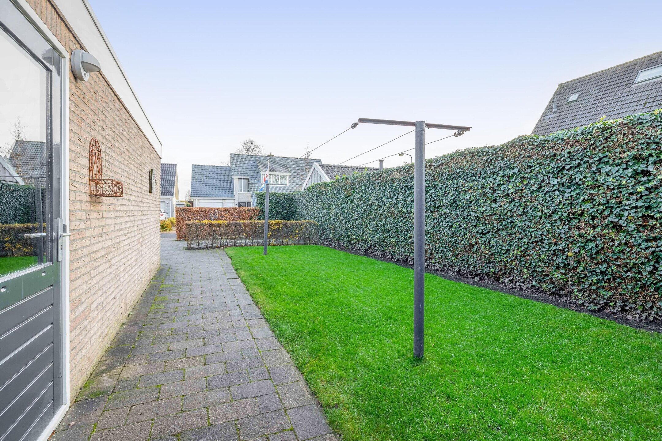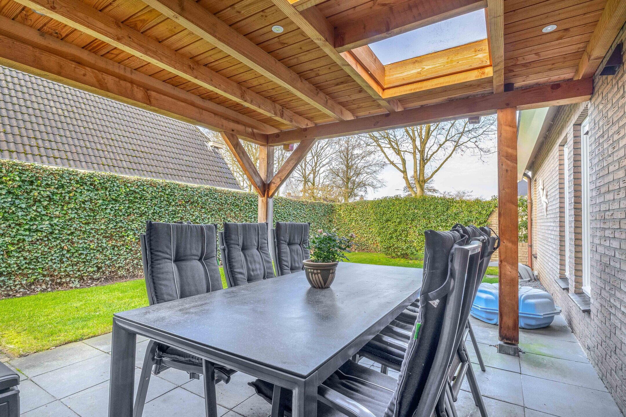 De tuin is rondom gelegen en netjes onderhouden. Er is een robotmaaier aanwezig. De heggen rondom bieden de nodige privacy en je hebt een eigen royale oprit met voldoende parkeerruimte. Ook is er een gedeelde grondwaterbron aanwezig. Achterin staat een tuinschuurtje en aan de zijkant, naast de keuken, is een overkapping met lichtkoepel geplaatst boven het terras waardoor je daar fijn en droog kunt zitten.